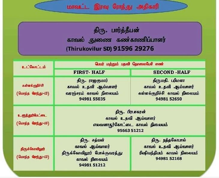 கள்ளக்குறிச்சி மாவட்டத்தில்(22.4.2025 ) இன்று 10:00 மணி முதல் காலை 6 மணி வரை இரவு ரோந்து பணிக்காக நியமிக்கப்பட்டுள்ள அதிகாரிகளின் பெயர் மற்றும் தொலைபேசி எண்கள் குறிப்பிடப்பட்டுள்ளது. அவசர உதவிக்கு மேற்கொண்ட அதிகாரிகளின் தொலைபேசி எண் மூலம் தொடர்பு கொண்டு தகவல் தெரிவிக்கலாம் அல்லது 100-க்கு டயல் செய்யலாம் என அறிவிக்கப்பட்டுள்ளது.