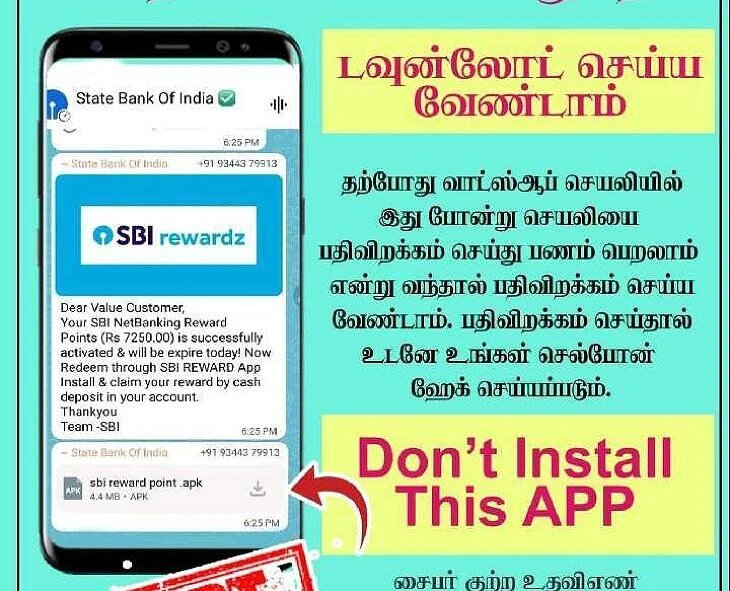 தற்பொழுது வாட்ஸ் செயலியில் ஸ்டேட் பேங்க் ஆப் இந்தியா என்ற பெயரில் தங்களுக்கு பணம் ரிவார்ட் கிடைத்துள்ளது என்ற பெயரில் அனுப்பப்படும் செயலியை யாரும் பதிவிறக்கம் செய்ய வேண்டாம். அவ்வாறு அனுப்பப்படும் செயலியை பதிவிறக்கம் செய்தால் உடனே தங்களது செல்போன் ஹேக் செய்யப்படும். எனவே பொதுமக்கள் கவனமாக இருக்குமாறு தேனி மாவட்ட காவல்துறையினர் எச்சரிக்கை விடுத்துள்ளனர்.