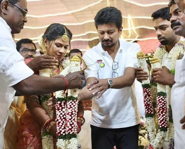 நாகையில் திமுக மாநில மீனவரணி துணை செயலாளர் மனோகரன் இல்லத் திருமண விழாவில் பங்கேற்று திருமணத்தை நடத்தி வைத்த துணை முதல்வர் உதயநிதி ஸ்டாலின் மணமக்களை வாழ்த்தி பேசினார். அப்போது, இல்ல இல்லத் இணைய உள்ள இணையர் இருவரும் கழகமும் கலைஞரும் போல் கழக தலைவரும் உழைப்பும் போல் பல்லாண்டு வாழ்க என பஞ்ச் வைத்து பேசினார்.