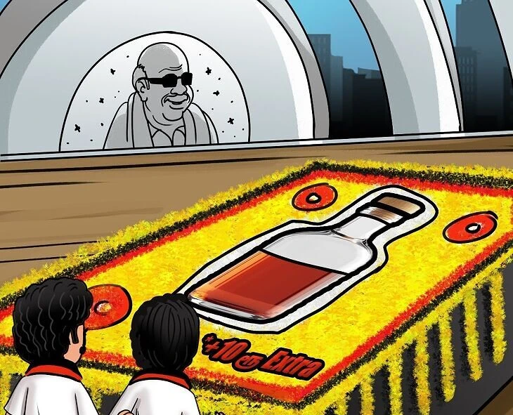 ஒவ்வொரு மானியக் கோரிக்கையின்போதும் மறைந்த திமுக தலைவர் கருணாநிதி நினைவிடத்தில் மலர்களால் அலங்காரம் செய்து, சம்பந்தப்பட்ட துறை அமைச்சர் மரியாதை செய்வது வழக்கம். இன்று மதுவிலக்கு & ஆயத்தீர்வைத் துறை மானியக் கோரிக்கை நடைபெறும் நிலையில், கருணாநிதி சமாதியில் Decoration-லாம் கரெக்ட்டா பண்ணியாச்சா “தியாகி” அமைச்சரே? என்று கேள்வியுடன் குவாட்டருக்கு ₹10 EXTRA என அதிமுக கார்ட்டூன் வெளியிட்டுள்ளது.